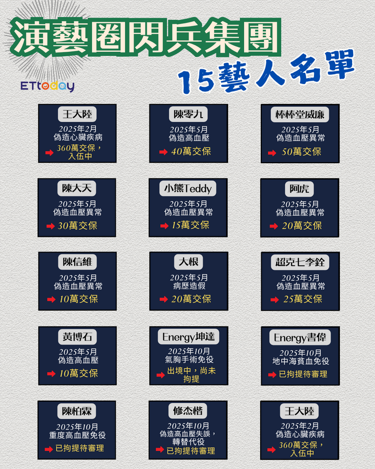 與鄭元暢形成強烈對比的是,2025年的「閃兵案」陸續爆出多名藝人涉嫌規避兵役。案件從今年2月王大陸遭檢警拘提後擴大,5月第二波偵查又牽出陳零九、威廉、陳大天、大根等人,10月第三波更傳出修杰楷、陳柏霖、Energy坤達與張書偉、棒棒堂小杰皆遭拘提或約談,總計已有15名藝人涉案,涉嫌透過金錢管道偽造病歷閃兵,震撼演藝圈。